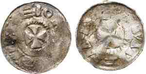 Beschreibung: | Sachsenpfennig, unbestimmte Münzstätte, möglicherweise Halle-Giebichenstein. 1,02 g und 1,18 g. Holzkirche mit Kreis in der Fassade, daneben im Feld je 3 Punkte, Trugschrift / Keilkreuz im Perlkreis, Trugschrift. Dannenberg - (vgl. 1332), Kilger Mg HP 2:1. 2 Stück. Fast sehr schön | |