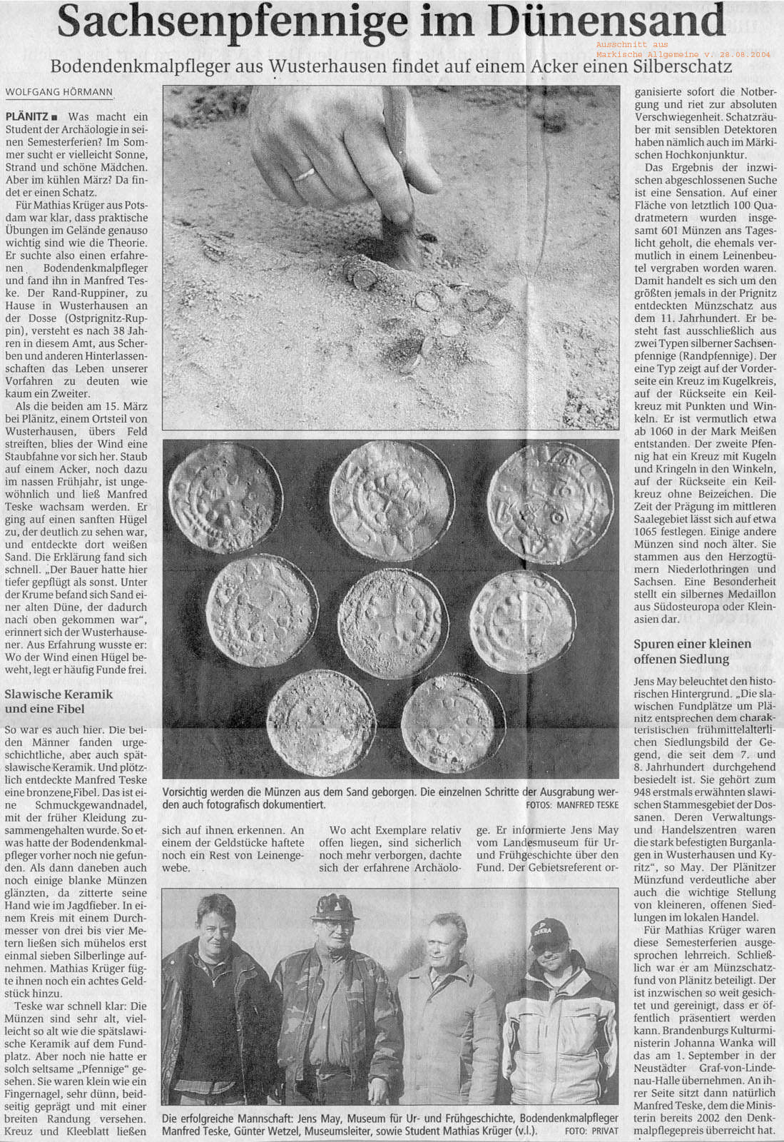 Bei der Begehung eines slawischen Siedlungsplatzes bei Plänitz, Lkr. Ostprignitz-Ruppin (Brandenburg) durch einen ehrenamtlichen Denkmalpfleger und einen Archäologiestudenten wurden am 15. März 2004 zunächst 8 Randpfennige aufgelesen. Bei der anschließenden Notbergung durch das Brandenburgisches Landesamt für Denkmalpflege konnten schließlich 601 Silbermünzen und ein Medaillon (Silbergewicht ingesamt 650g) auf einer Fläche von 100 qm geborgen werden.